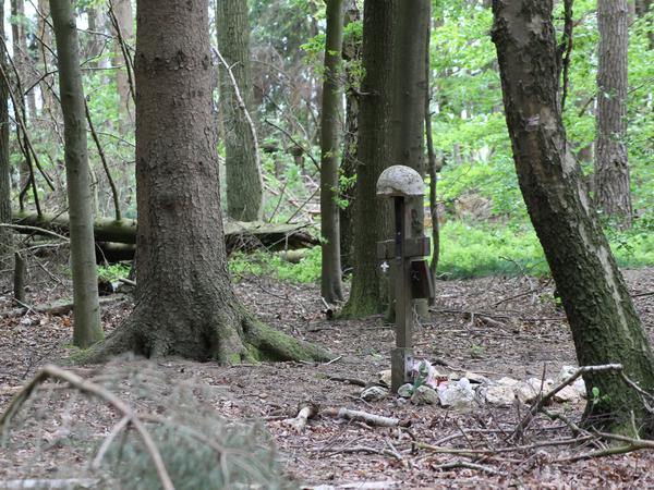 Hinter der Wiese beginnt der Wald. Nach wenigen Metern stehen Wanderer vor einem Gedenkkreuz, auf dessen Spitze ein Stahlhelm-Imitat aus Beton angebracht ist. Es erinnert an die Soldaten einer amerikanischen MG-Einheit, deren sterbliche Überreste erst 55 Jahre nach den Kämpfen gefunden wurden. Der Wald ist hier besonders dicht. Die Fichten wachsen im Abstand von zwei bis drei Metern kerzengrade aus dem Boden. Buch schätzt ihr Alter auf 40 bis 50 Jahre. Nachkriegsware also.