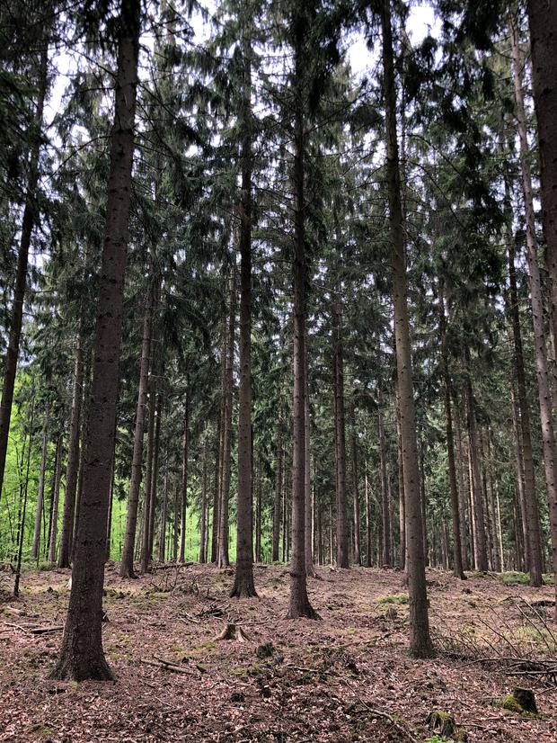 „So ähnlich hat es hier ausgesehen, als die Kämpfe begannen“, sagt Buch. Damals dämpften allerdings die dicht-grünen Baumkronen die Sonnenstrahlen zu einem unheimlichen Zwielicht am Boden. Auf Hemingway wirkten die Eifelwälder deshalb „wie Kulissen zu Grimms Märchen, nur noch grimmiger“. Heute sind die Wipfel braun oder gleich ganz verschwunden. Mit der Trockenheit der vergangenen Jahre kam der gefräßige Borkenkäfer.