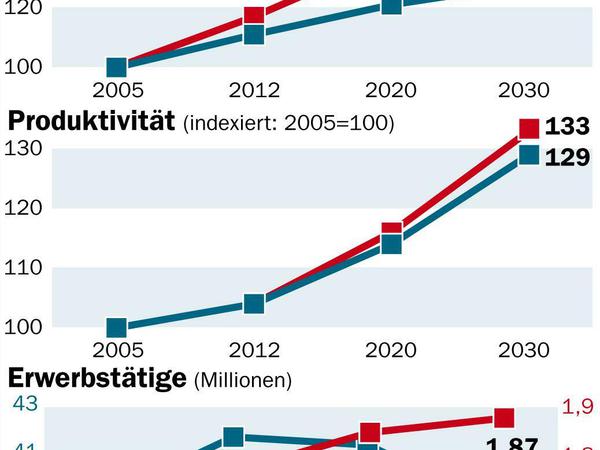 Berlins Wirtschaft soll bis 2030 stärker sein als der Bundesschnitt. Die Berliner Industrie- und Handelskammer und das Deutsche Institut für Wirtschaftsforschung sagen ein Wachstum von bis zu 80 Prozent voraus – sogar andere europäische Metropolen sollen eingeholt werden.