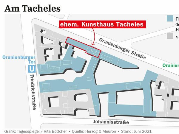 Anders als von der Vorbesitzerin, der Jagdfeld-Gruppe, vorgesehen, wird der Torbogen der ehemaligen Ruine wieder ein Portal bekommen. Aufgenommen wurde das Projekt 2015, der Bauvorbescheid kam 2016. In jenem Jahr fanden auch die ersten Erdbauarbeiten statt, der Rohbau begann 2018 – inzwischen hat der Bau an Höhe gewonnen. Seit 2019 arbeitet man sich mit dem Unternehmen Hochtief an den oberirdischen Bauteilen ab. Bis dato gab es keinen Tag Verzögerung. Der Innenausbau begann vor vier Monaten; Ende 2022 soll der erste Teil des Baus eröffnet werden. Dann werden Teile der Front an der Friedrichstraße fertig und das Kunsthaus Tacheles.