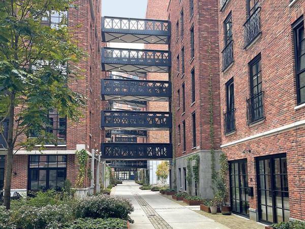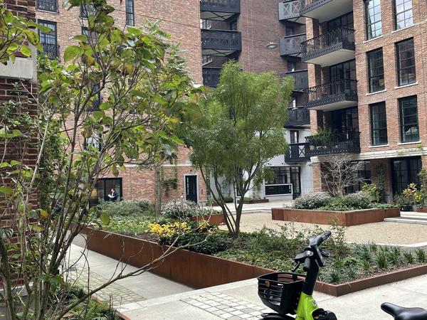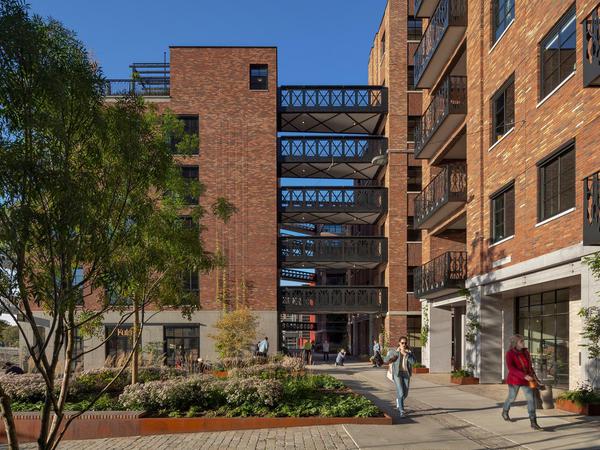 Die Häuser gruppieren sich um drei Plätze, die zum Aufenthalt einladen, mit großzügigen Blumenbeeten und niedrigen Büschen und je einem großen Baum. Kletterpflanzen wie Blauer Regen winden sich an den Fassaden empor. Aus jeder Wohnung schaut man entweder auf einen der drei Plätze oder auf das Wasser des Coolhaven. Drei Häuser teilen sich jeweils den Lift in dem höchsten der drei Gebäude. Über insgesamt 46 Stahlbrücken, die der Designer Ruud-Jan Kokke ebenso entworfen hat wie die Balkongitter, gelangt man aus den Häusern ohne Lift zum Aufzug. So entsteht sofort der Meatpacking-District-Look. Durch die Verlagerung der Fluchttreppe an die Fassade – wie in New York – gewinnen die Architekten mehr Raum für die Wohnungen im Innern und mehr Variationsmöglichkeiten.