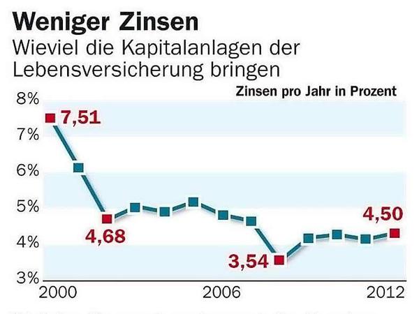 Noch können sich die Versicherer mit ihren höherverzinsten, langlaufenden Wertpapieren aus früheren Jahren retten. Doch das Polster schwindet. Kunden, deren Lebensversicherungen auslaufen, müssen nämlich per Gesetz zur Hälfte an den Kursgewinnen beteiligt werden. Das zehrt an den Milliardenreserven. Von den fünf Milliarden Euro, die die Lebensversicherer im vergangenen Jahr über den Garantiezins hinaus erwirtschaftet haben, haben sie drei Milliarden als Beteiligung an den Bewertungsreserven ausschütten müssen, berichtet der Versicherungsverband GDV. Und 2013 sieht es nicht besser aus: Es sei „mit einer vergleichbar hohen Ausschüttung von Bewertungsreserven wie 2012 zu rechnen“, heißt es im Lagebericht des Bundesfinanzministeriums. „Dies führt zu einer Verschlechterung der künftigen Risikotragfähigkeit der Versicherer.“