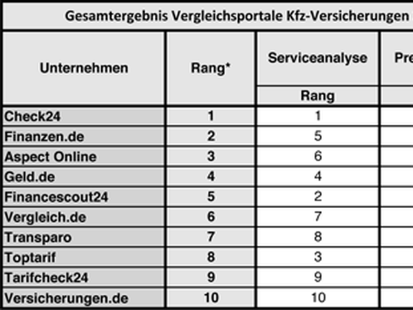 Testsieger wurde Kfz-Versicherungsrechner von „check24.de“. Sowohl bei der Preisanalyse als auch beim geprüften Service konnte sich das Portal den ersten Platz sichern. Danach folgt mit einem 5. Platz (Service) und einem zweiten Platz die Seite von „Finanzen.de“. Rang drei ging an „Aspect Online“.