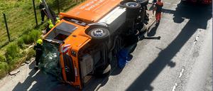 Ein voll beladenener Müllwagen kippte am Mittwoch in einer Kurve um. Ein Kran soll es wieder aufrichten. Doch das ist gar nicht so einfach.