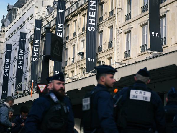 Seit dem Vorabend bewachten Sicherheitskräfte das Kaufhaus, an dessen Fassade ein großes Plakat mit den Porträts der Unternehmenschefs von BHV und Shein hing. „Schützt die Kinder und nicht Shein“, war auf einem Plakat von Demonstranten zu lesen.