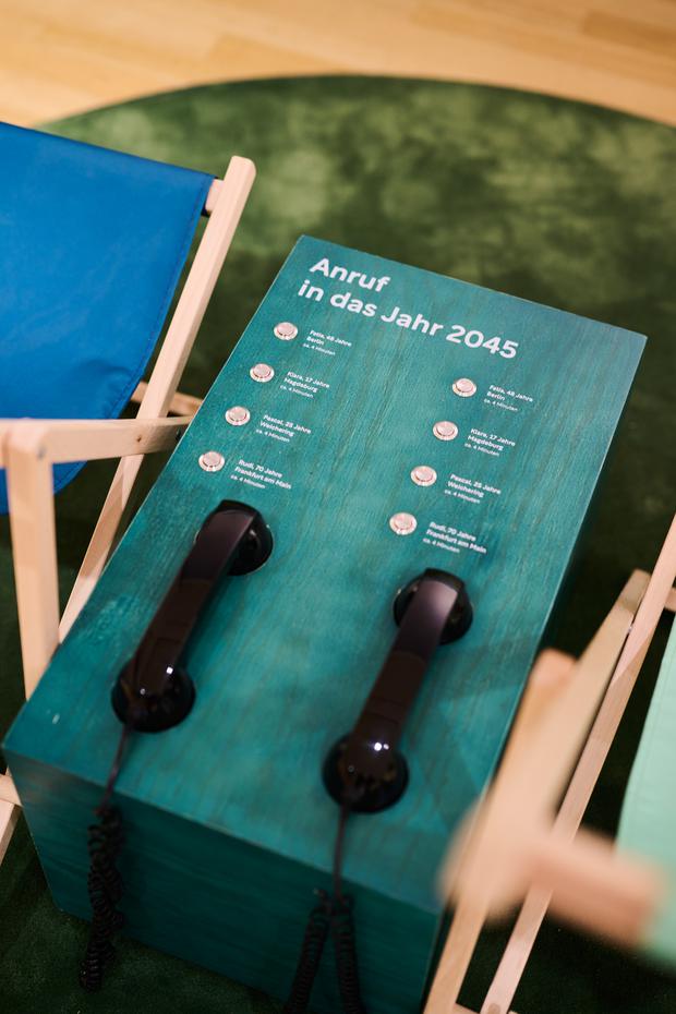 Im Gegensatz zu vielen anderen Auseinandersetzungen mit dem Thema entlässt die Ausstellung die Besucher:innen mit einem Gefühl von Hoffnung: Neben dem Anruf in die Zukunft kann man im letzten Raum durch ein Fernrohr sehen, wie Berlin im Jahr 2045 aussehen könnte: sehr grün, viele Fahrräder, klare Luft.
