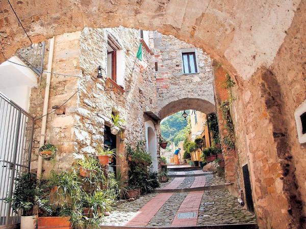 In Pigna heißen die Gassen „chibi“ (dunkel). Auch tagsüber brennen Laternen mit gelblichem Licht. In Apricale trotzt die erste mächtige Palme den Kiefern und Steineichen des Hinterlandes. Wir bewundern siebenhundert Jahre alte Fresken in der Kirche Santa Maria degli Angeli und fragen uns, wie so zart gestaltende Künstler in diese bäuerlichen Täler kamen. Wir wandern auf einem schmalen Pfad nach Airole, brauchen lange, weil wir Pflaumen von Bäumen pflücken. Die stehen verlassen auf uralten, halb überwucherten Terrassen. Die Bauern haben aufgegeben, sie zu bestellen.