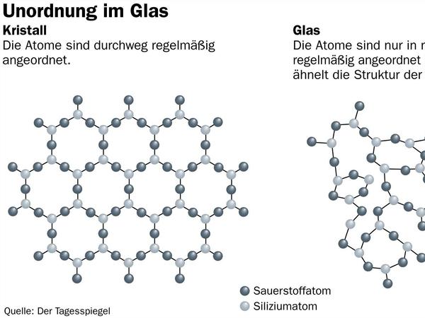 Im Vergleich zu einem Kristall ist das Gebilde also ziemlich liederlich. „Das ist eines der Probleme, die wir mit Glas haben“, sagt Liesbeth Janssen von der Columbia-Universität in New York. „Auf mikroskopischer Ebene ändert sich beim Erstarren nichts. Die Atome sind angeordnet wie in einer Flüssigkeit. Aber makroskopisch verhält sich Glas wie ein Festkörper.“