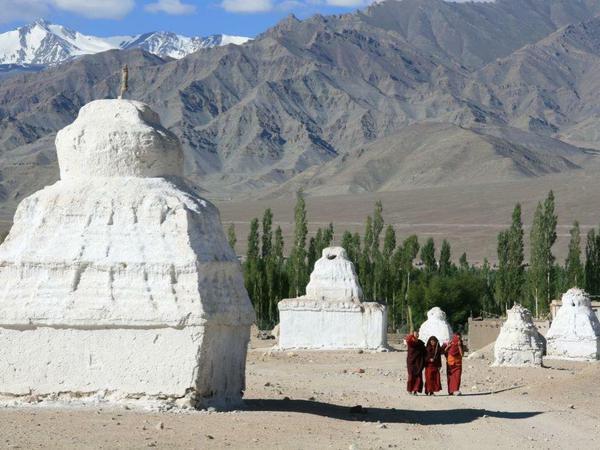 Wie Perlen an einer Kette reihen sich die ladakhischen Siedlungen den Indus entlang. Schon bald sehen wir die bedeutenden Klöster Hemis, Stakna, Thikse, Shey – die ersten von unzähligen buddhistischen Anlagen, die in Ladakh zu besichtigen sind. Die Region um die Hauptstadt Leh ist die kulturell reichste im Westhimalaja, ein Muss für kulturinteressierte Touristen, die es bis hier schaffen. Von der Abendsonne angestrahlt, begrüßt uns in Leh der neunstöckige Königspalast, der im Baustil an den Potalapalast von Lhasa erinnert.
