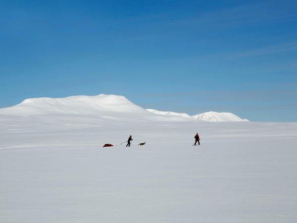Tag zwei: ausgiebig frühstücken, Lebensmittel einkaufen, die fünf Hightech-Schlitten beladen, Gurtzeug anlegen, Skier anschnallen und los. Stunde um Stunde scheint jeder der 35-Kilo-Schlitten schwerer zu werden. Wer das Tempo der Gruppe nicht mehr halten kann, bekommt Unterstützung von Biigha oder Nemi. Dann werden die Huskys mit eingespannt, was ihnen größte Freude zu bereiten scheint. Sie strotzen nur so vor Energie.