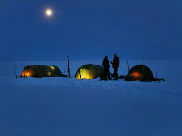 Der Morgen des vierten Tages beginnt mit Sonne. Die Temperatur klettert von minus 23 Grad auf minus 18. Immerhin. Liv lockt mit frisch gebrühtem Kaffee und heißem Müsli. Tut das gut! Dann heißt es, die völlig vereisten Zelte abbauen. Die Atemluft kondensiert nachts an den Innenwänden.