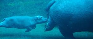 Der Nachwuchs im Berliner Zoo ist ab sofort täglich für Besucher zu sehen. Beim ersten Ausflug ins Hippo Bay schob Mutter Nala ihr Junges immer wieder behutsam ins Flache.