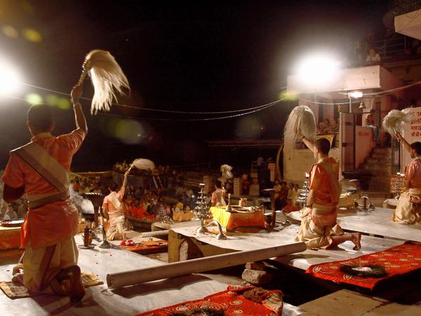 Über dem Ganges dämmert der Abend. Das Ghat ist von Scheinwerfern in gelbes Licht getaucht, viele Menschen haben sich eingefunden. Auf den Stufen, die zum Wasser führen, sind Altare aufgebaut, festlich mit Blumen geschmückt. Kelche, aus denen Flammen züngeln, Schalen mit Gewürzen und goldene Glocken stehen darauf. Wir suchen uns einen Platz, um das Spektakel zu beobachten. Jeden Abend findet hier eine hinduistische Zeremonie zu Ehren Mutter Ganges statt. In goldene und rosa Seide gehüllte Männer besetzen die Altare. Einer der Hindu-Priester singt in ein Mikrofon, andere schlagen Becken, einer läutet die Glocke. Die Einheimischen, Sadhus und Pilger, falten die Hände und schließen die Augen.